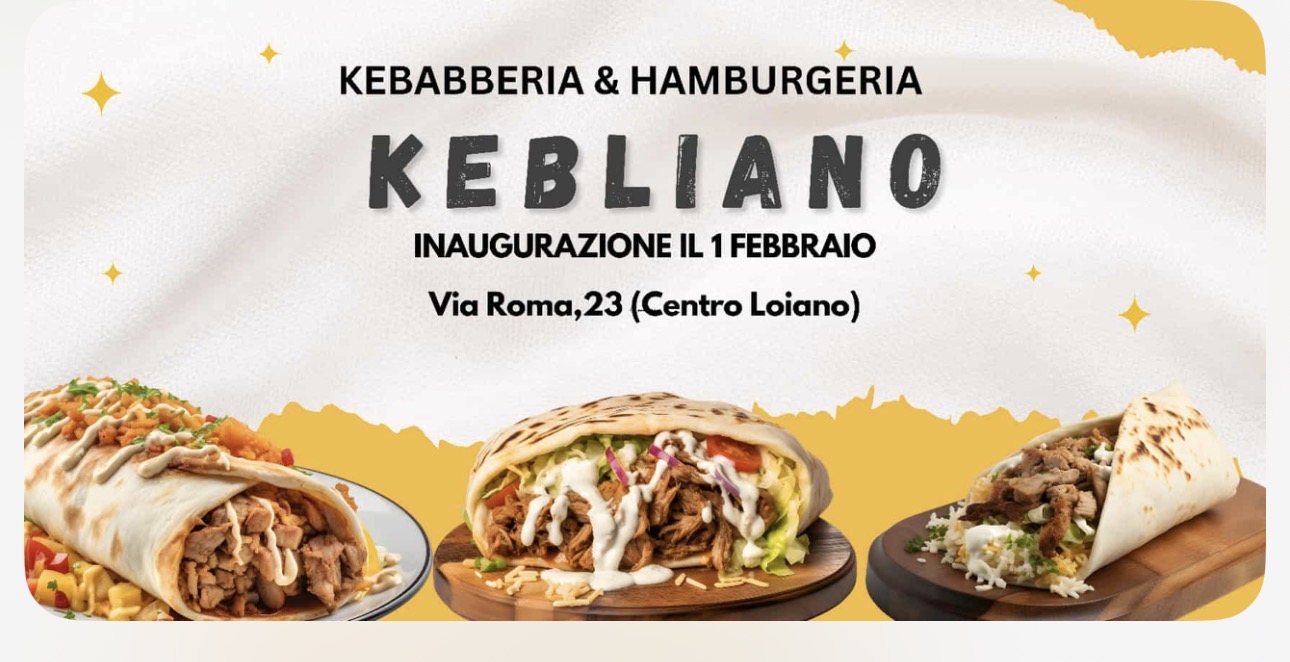 NUOVA KEBABBERIA A LOIANO domenica 1 febbraio inaugura ‘Kebliano’, il nuovo locale in via Roma 23 (ex negozio di Sara parrucchiera). Nei prossimi giorni ulteriori info su orari, menù ecc.