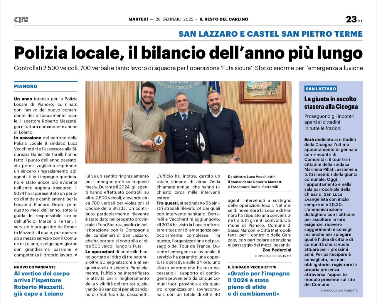 Sul Carlino di oggi il ringraziamento al Comandante Roberto Mazzetti ed alla Polizia Locale di Pianoro da parte del Sindaco Luca Vecchiettini. Roberto Mazzetti è anche il Comandante della PL di Loiano.