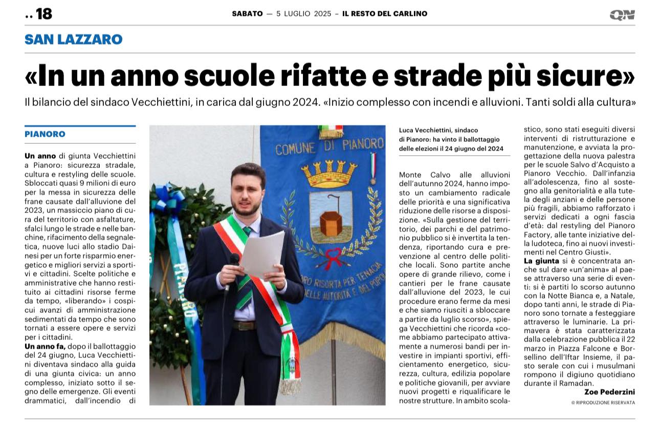 Politica Jul 20 / 0 Comments Pianoro, un bilancio del primo anno del sindaco Luca Vecchiettini Ieri sul Carlino un bilancio del primo anno dell’ amministrazione del Sindaco Luca Vecchiettini Aggiungi un commento Il tuo nome Email Il contenuto di questo campo è privato e non verrà mostrato pubblicamente. Homepage Oggetto Comment Riguardo ai formati testo HTML ristretto Elementi HTML permessi: <a href hreflang> <em> <strong> <cite> <blockquote cite> <code> <ul type> <ol start type> <li> <dl> <dt> <dd> <h2 id> <h3 id> <h4 id> <h5 id> <h6 id> Linee e paragrafi vanno a capo automaticamente. Indirizzi web ed indirizzi e-mail diventano automaticamente dei link.