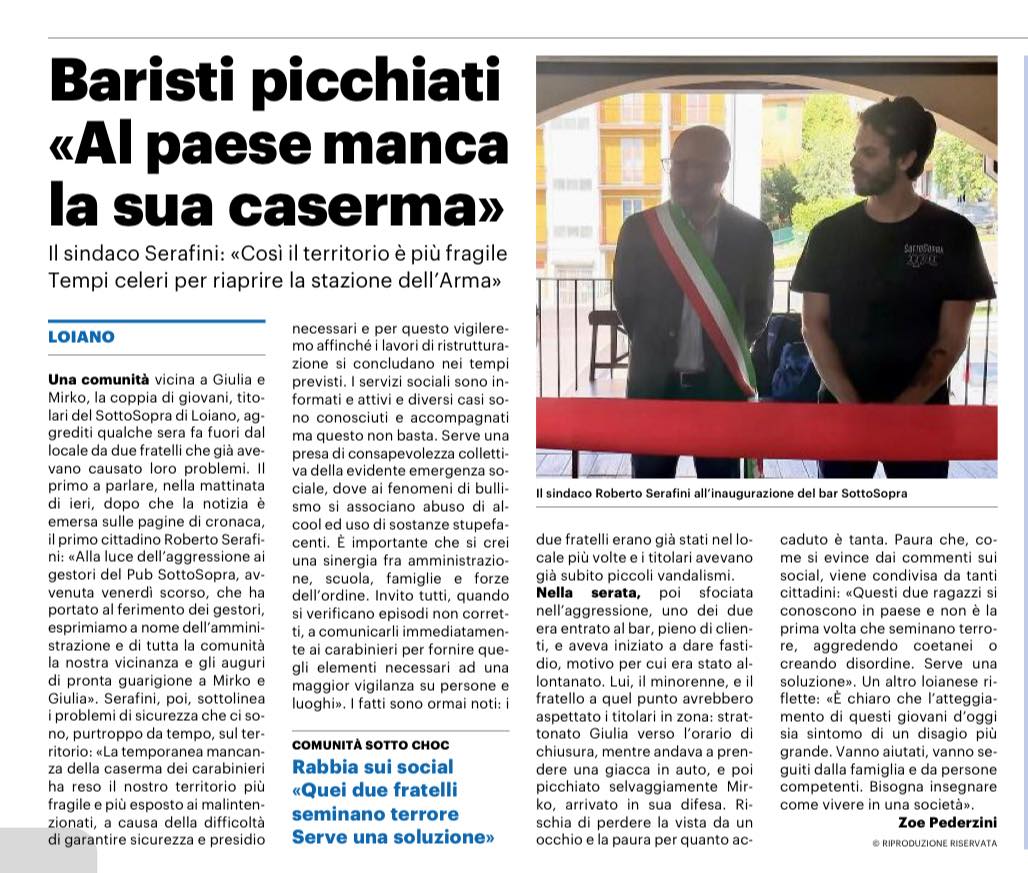 Commercio May 25 / 0 Comments "Quando si verificano episodi non corretti, comunicarli ai Carabinieri”. Il Carlino torna oggi sull'aggressione ai titolari del pub SottoSopra Il Carlino torna oggi sull’aggressione ai titolari del pub SottoSopra con alcune dichiarazioni del sindaco Aggiungi un commento Il tuo nome Email Il contenuto di questo campo è privato e non verrà mostrato pubblicamente. Homepage Oggetto Comment Riguardo ai formati testo HTML ristretto Elementi HTML permessi: <a href hreflang> <em> <strong> <cite> <blockquote cite> <code> <ul type> <ol start type> <li> <dl> <dt> <dd> <h2 id> <h3 id> <h4 id> <h5 id> <h6 id> Linee e paragrafi vanno a capo automaticamente. Indirizzi web ed indirizzi e-mail diventano automaticamente dei link.
